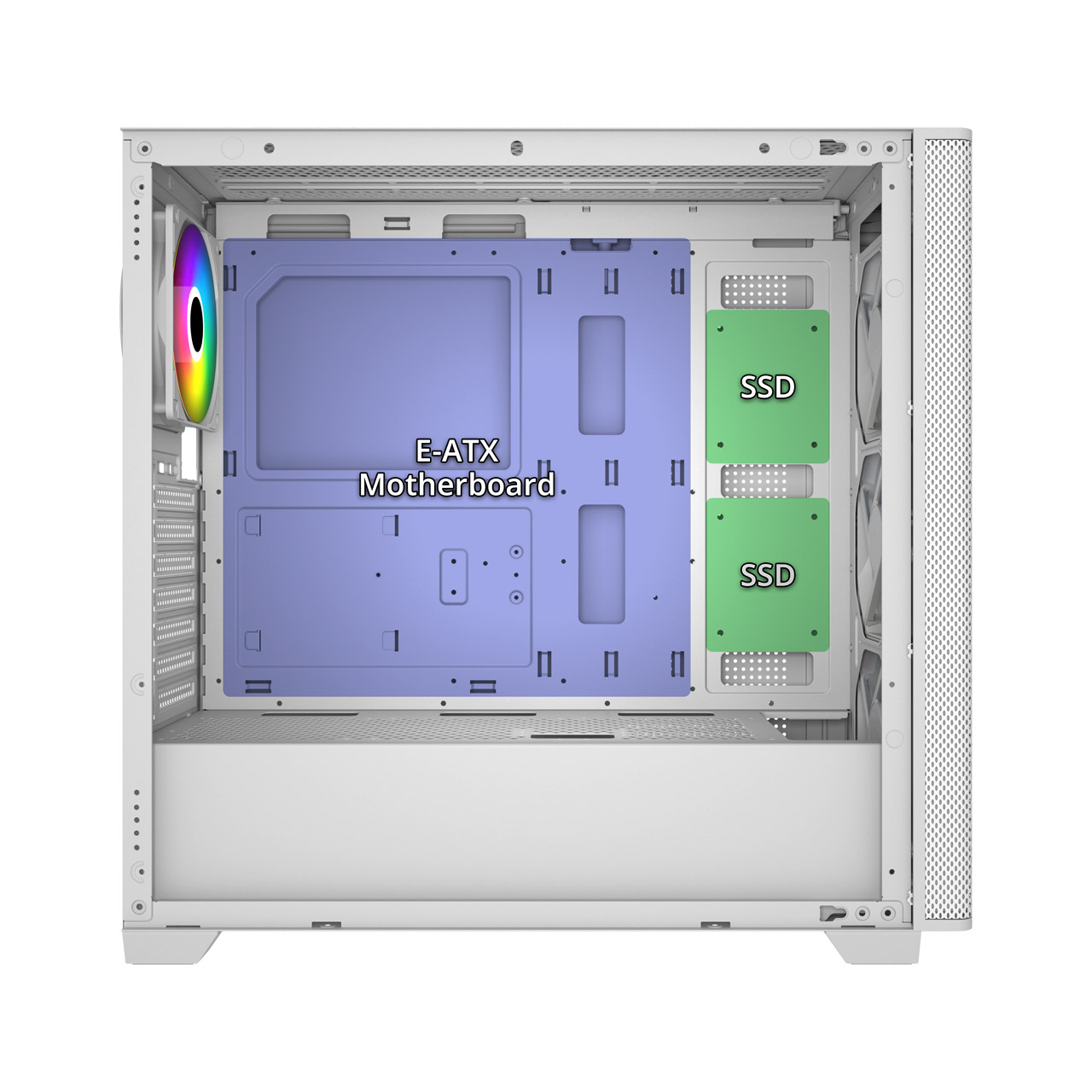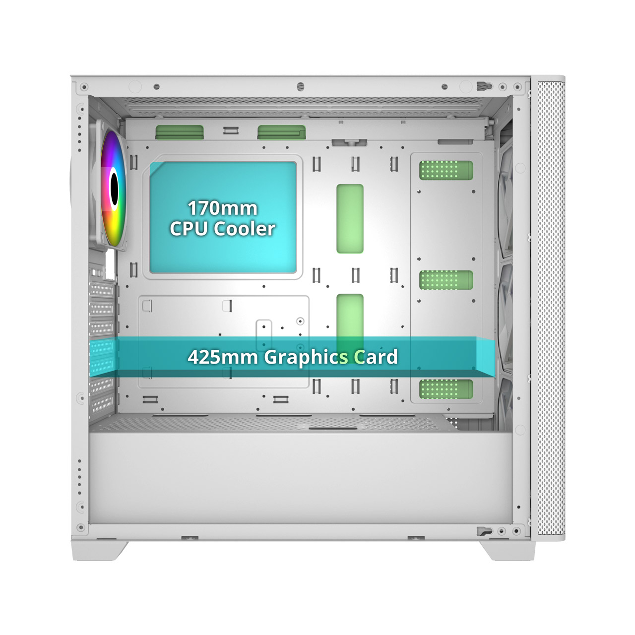 - 靈活擴充性:支援 Mini-ITX 至 E-ATX 主機板,同時容納多顆儲存裝置,並內建 USB 與高速 Type-C 接口。此外前、上側可裝360水冷排,支援最大425mm顯卡及170mm的塔型散熱器。即便最新型高階顯卡也能輕鬆安裝,完整應對未來升級需求!