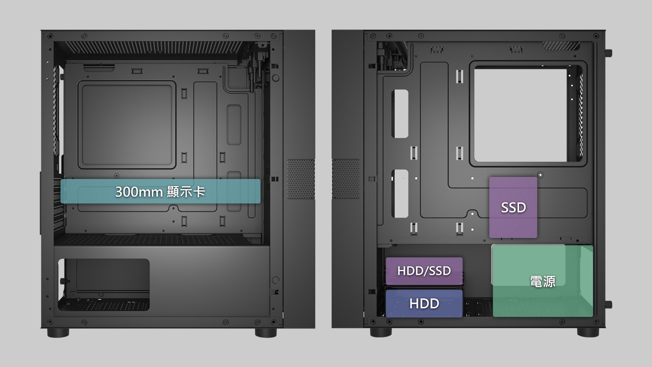 - 空間規劃精巧:支援 Micro-ATX 與 Mini-ITX 主機板,更搭載專屬硬碟架,內部設計兼顧走線便利與安裝彈性。