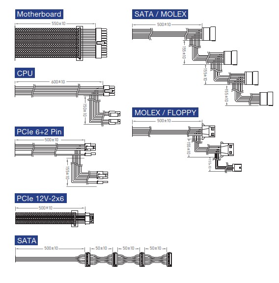 | MB 20+4 PIN | CPU 8 PIN | CPU 4+4 PIN | PCIe 12V-2x6 | PCIe 6+2 PIN | SATA | MOLEX | FLOPPY | |