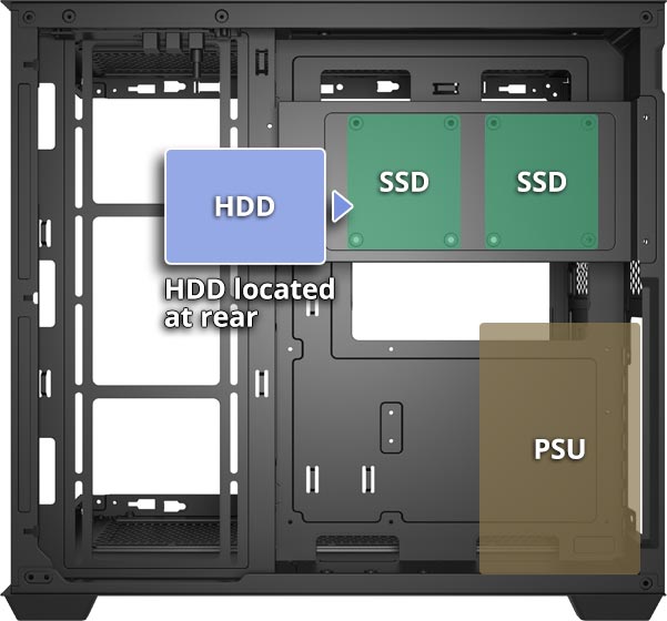 The advanced dual-chamber layout isolates the power supply and cables for better cable management and a cleaner build. With unobstructed airflow and ample room for high-end hardware, your system stays organized, efficient, and visually refined.