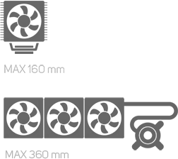 The M580 PRO supports liquid cooling radiators ranging from 240 to 360 mm. Additionally, it supports air coolers up to 160 mm in height, covering most types available on the market.