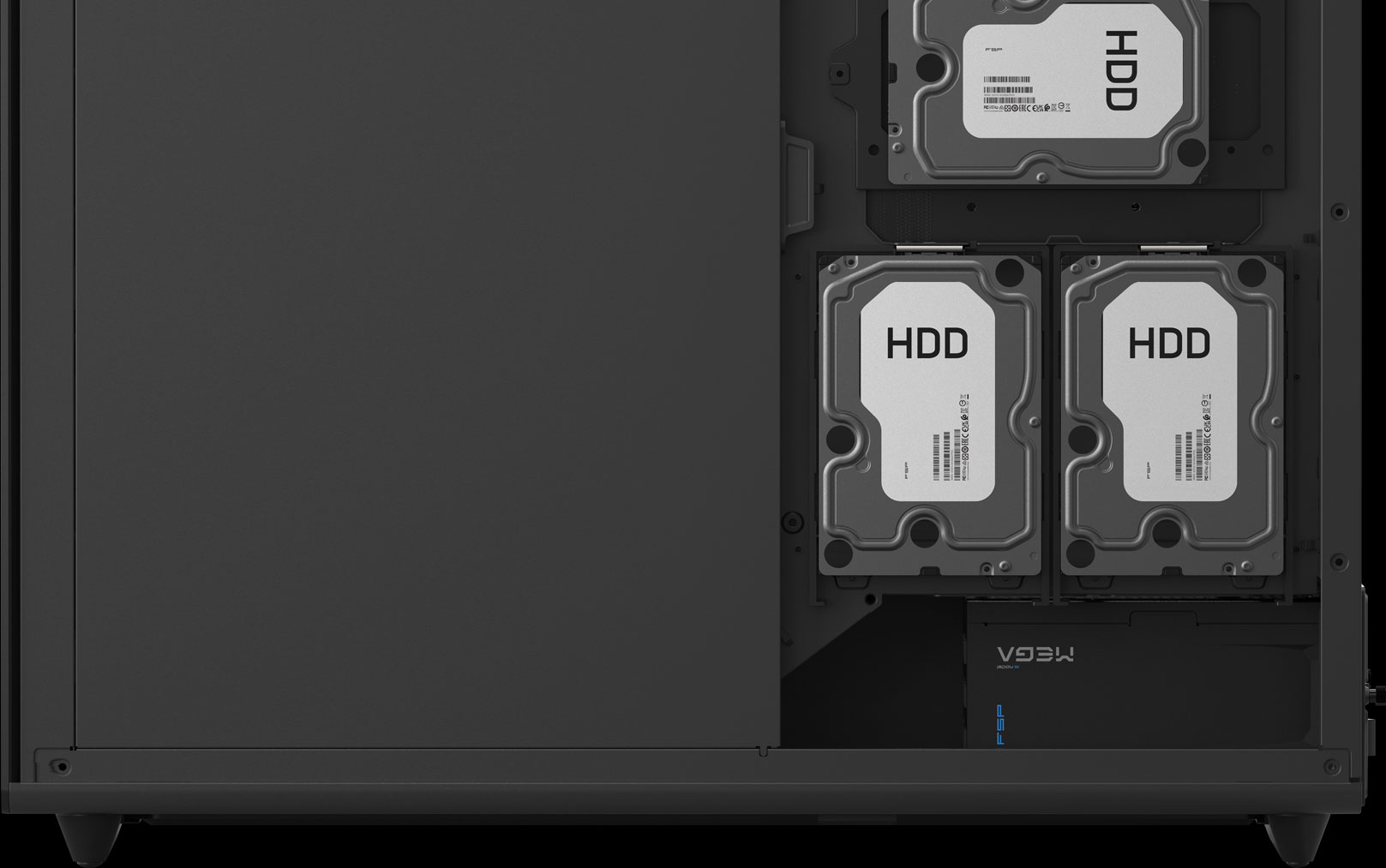 With tool-less drive bays, the U590 supports multiple 2.5” SSDs and 3.5” HDDs, ensuring ample storage for creators and gamers. Integrated cable shielding panels keep your build clean and airflow unobstructed.