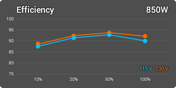 Hydro PTM PROは80 PLUS® Platinum認証を取得しています。20%から100%の負荷環境下において80 PLUS® Platinumは、90%以上(20%負荷時)、92%以上(50%負荷時)、89%以上(100%負荷時)の効率性を発揮する製品に対する認証です。